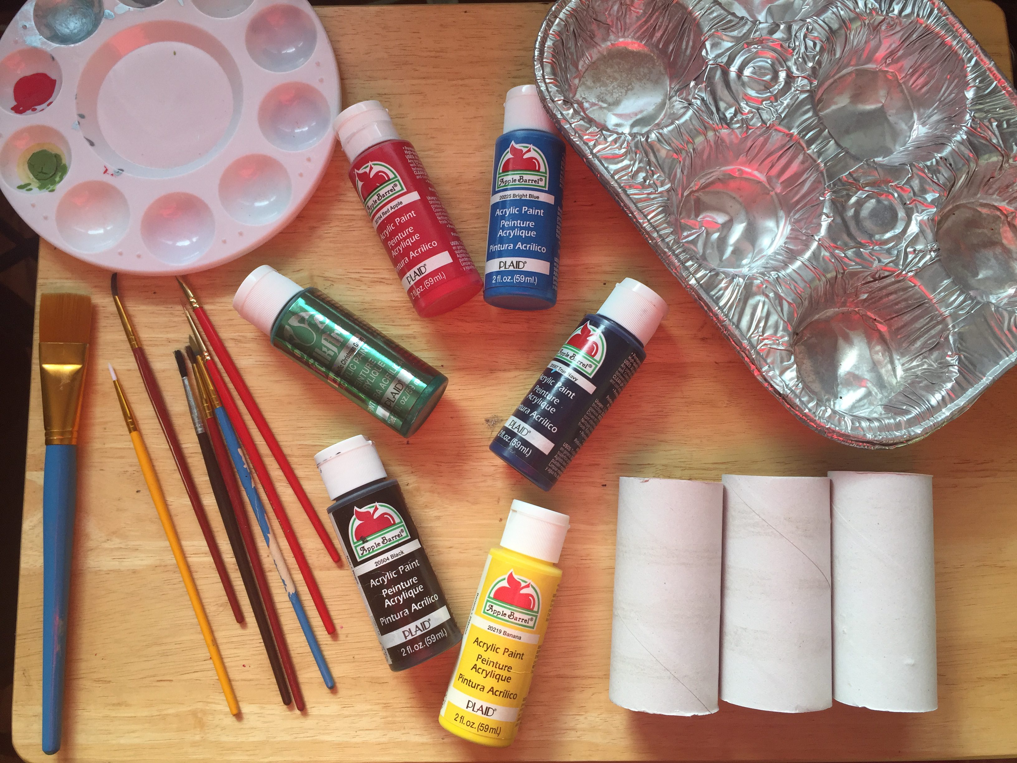 Not pictured: paper towels, water to rinse off brushes, glue or something to put together the rolls, scissors, lastly, Christmas music or movie! Get in to the Christmas spirit!