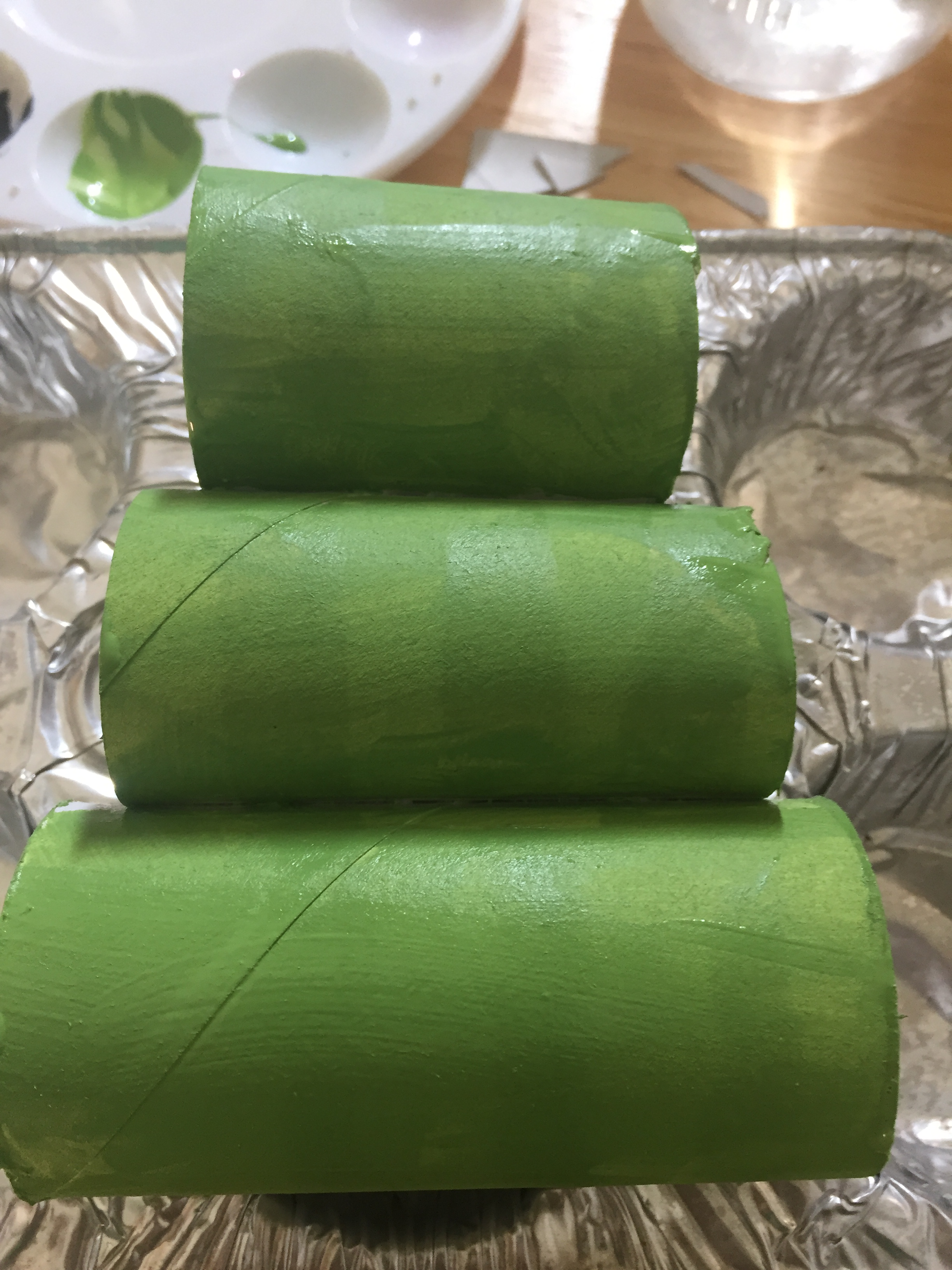 Step 3: Start with one side of your tubes and paint a thin layer with your green paint. Let it dry for about 3 minutes and paint on a second coat.