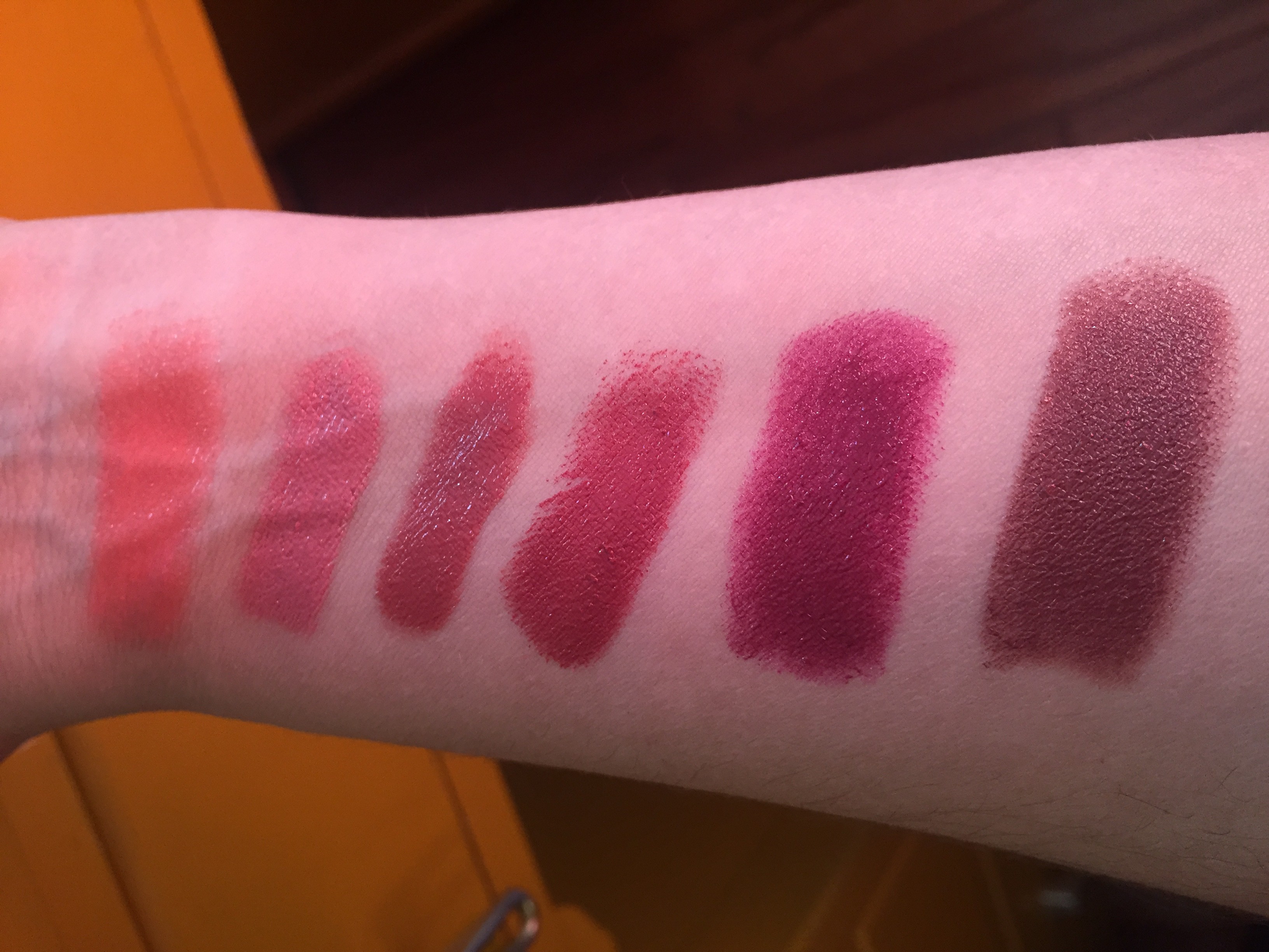 Left to Right: Juicy Papaya, Naked, N9, Berry Exciting, Blissful Berry, Untainted Spice